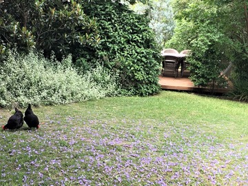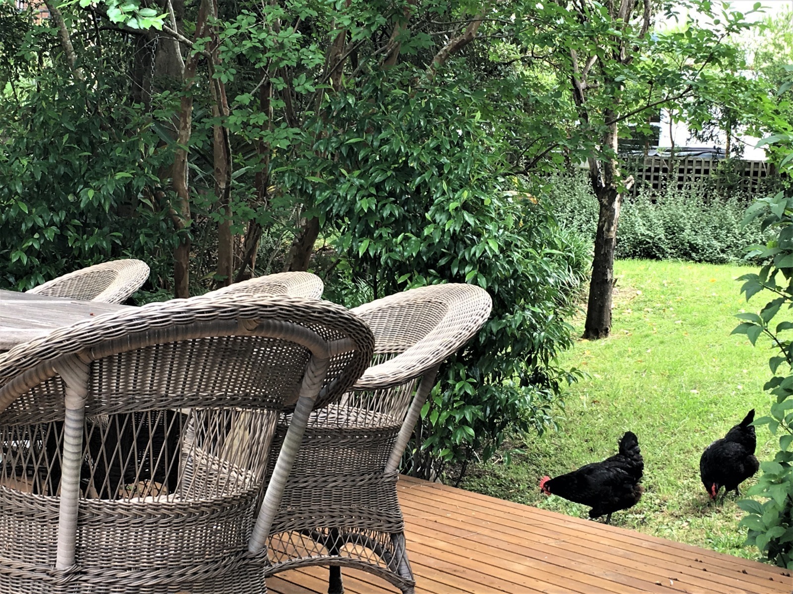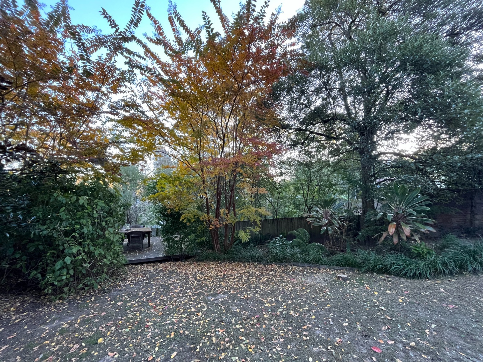 Serene and spacious backyard adjoining a nature reserve. Features a large secluded deck with 8 person table and chairs. Wide side access for crews and equipment.