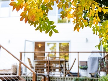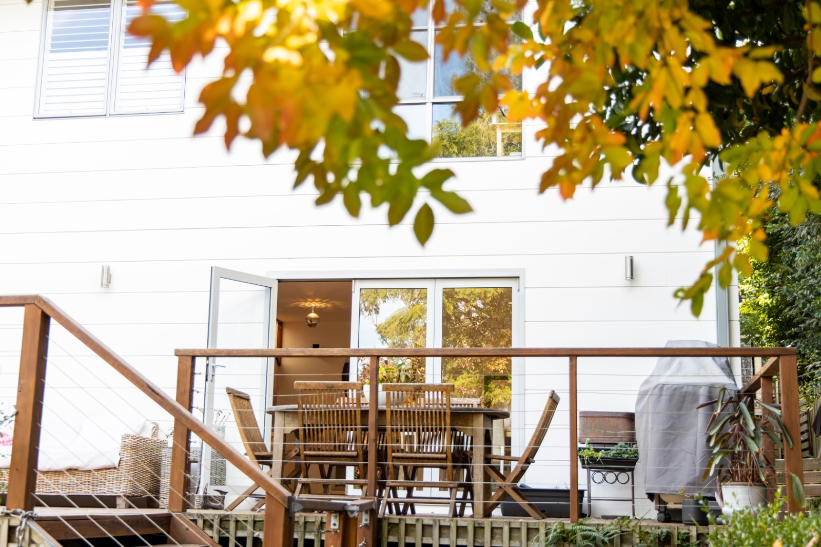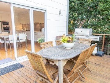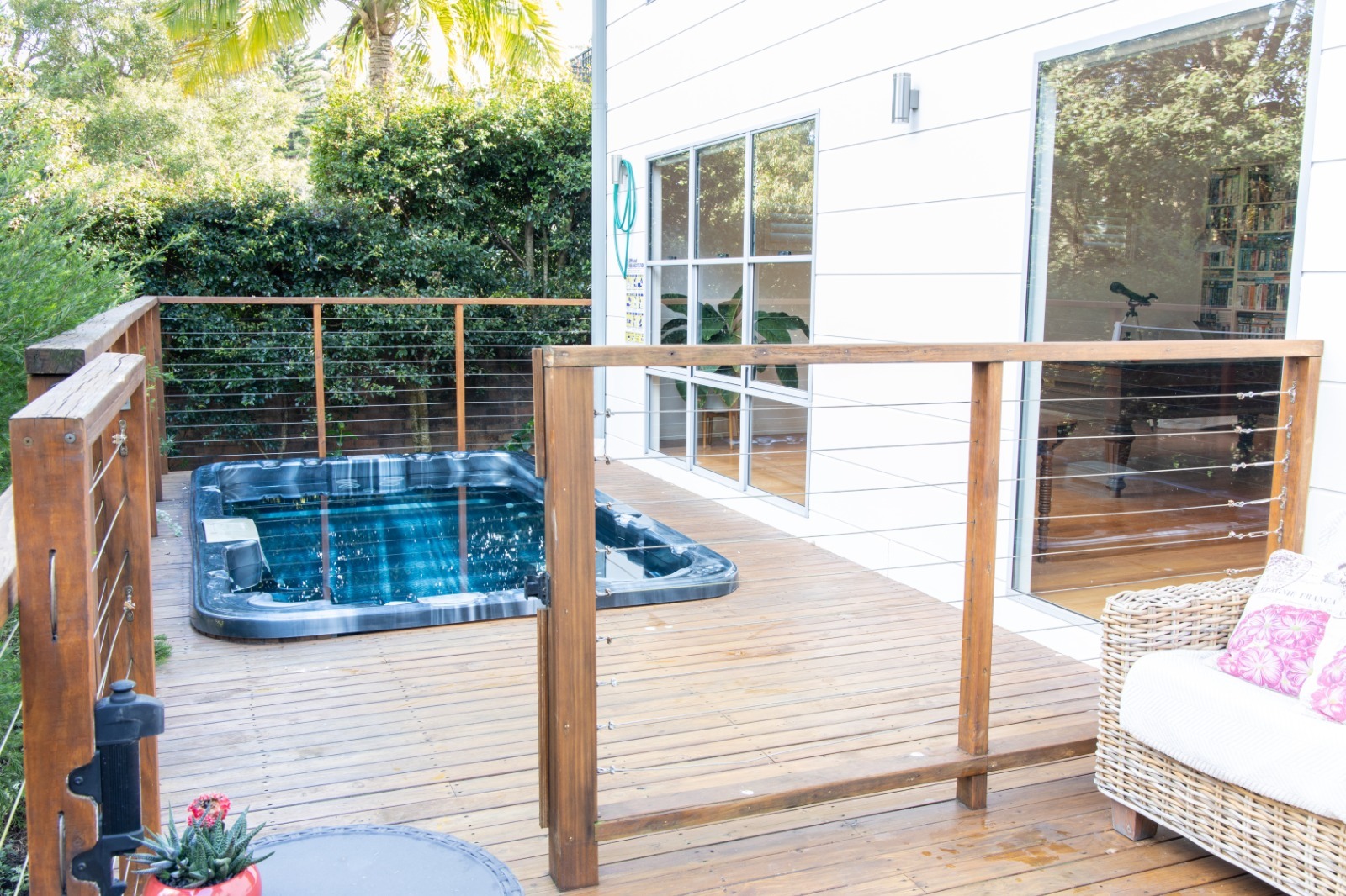 Spacious deck, lounge and spa accessed via bifold doors from kitchen and dining area. Spa fits 12 people and deck overlooks expansive and secluded garden complete with chickens and native Australian wildlife. Quiet location with easy access for crews and equipment.