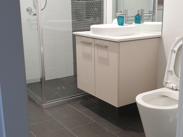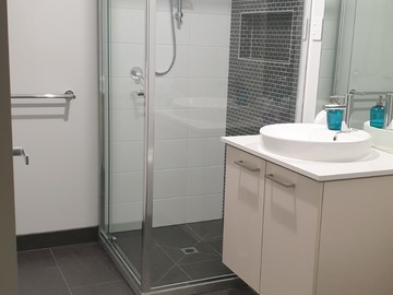 Medium sized ensuite in guest bedroom next to all in white walk in robe , available for shoot. Guest bedroom and ensuite is mostly unused is located on upper level of double storey home with big landing and a small balcony.