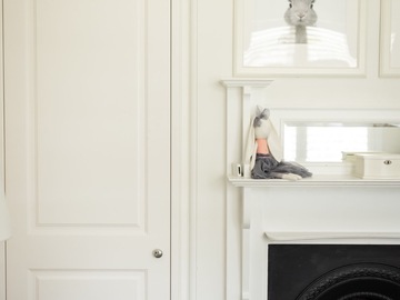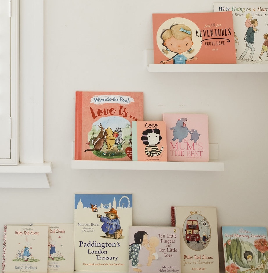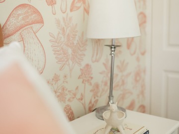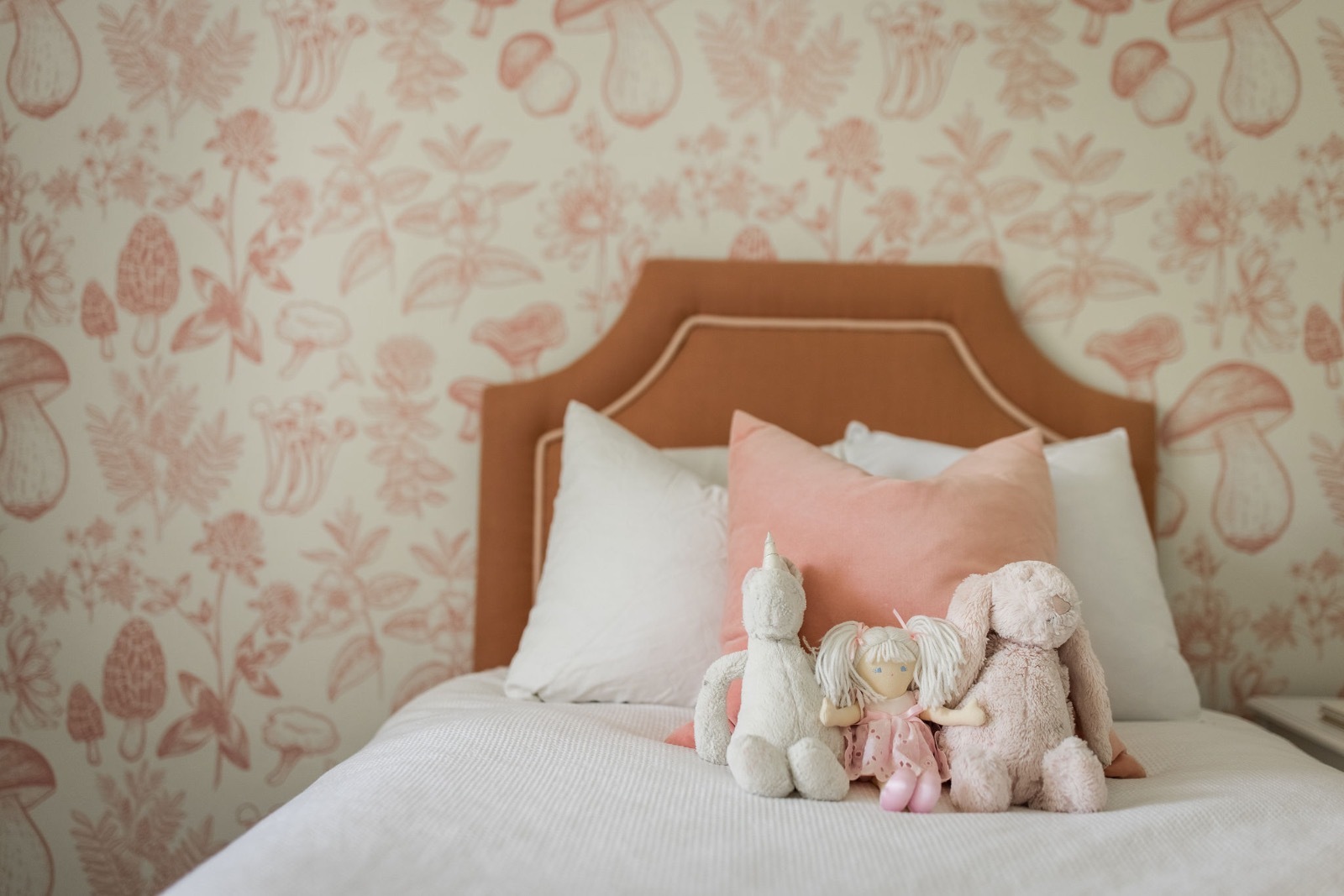 Young Girls Bedroom - Pale pink mushroom themed wallpaper, dusty pink bedhead, sweet decor.