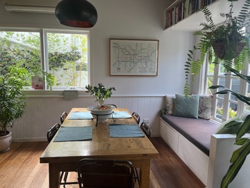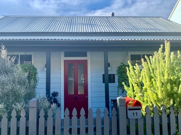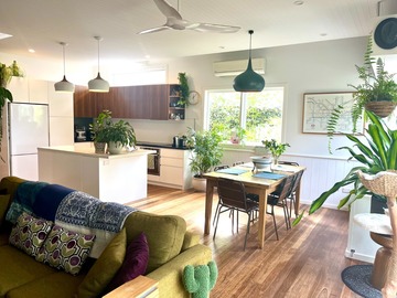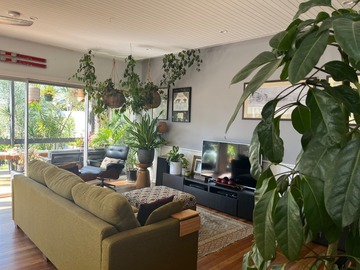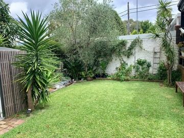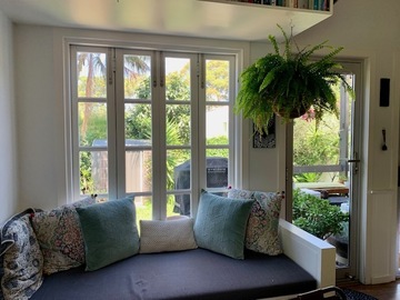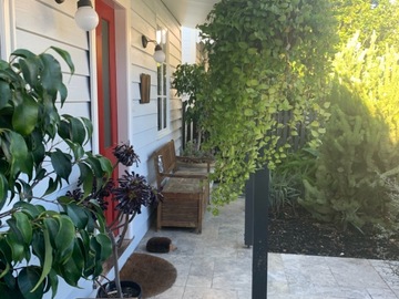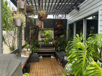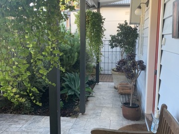 5 bedroom cottage. Lots of hanging plants. Small outdoor space with lawn.