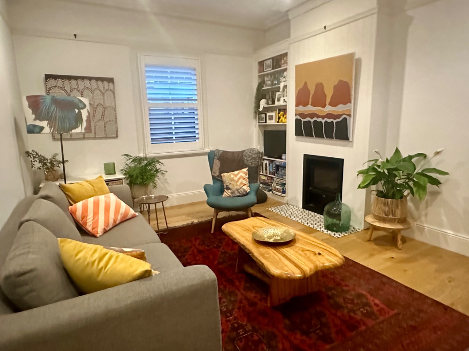 Cosy second living space with study area. Wood fireplace, v groove paneling and 2 big skylights to flood this room with natural light. Seamless flow into the main kitchen living area