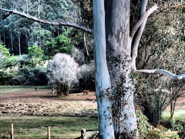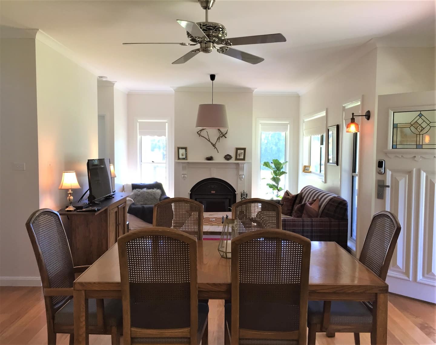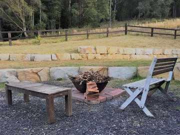 Indoor fireplace, ornate tile verandah, open plan living, beds for 7 people including bedroom with direct access to verandah, kitchen, bathroom, powder room, laundry, attic queen bedroom with ensuite, outdoor fire pit with firewood, cow paddock, adjacent to Ourimbah State Forest.