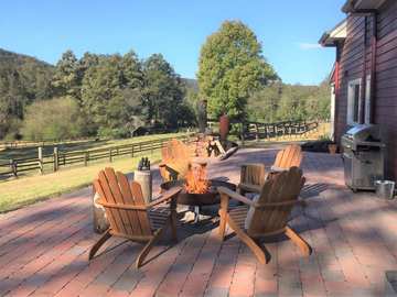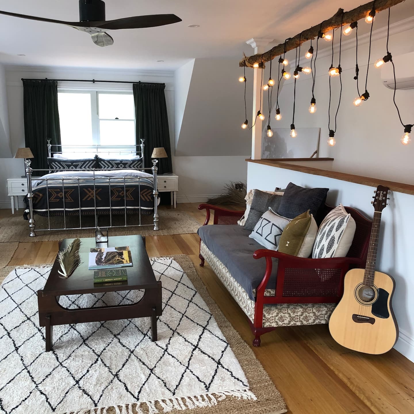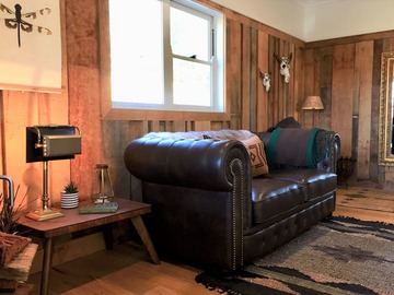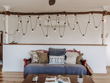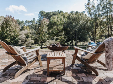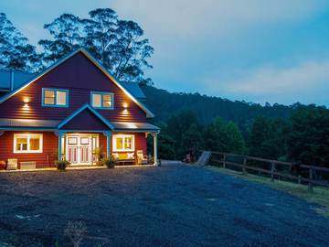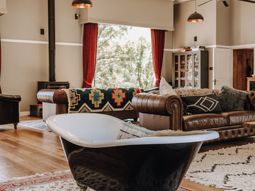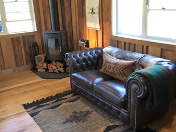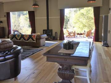 Open plan layout, tiled verandah, saloon style bar with 3m long blue gum timber bar top, two indoor fireplaces, Dining table for ten, kitchen, working desk area, bathroom, large TV, chesterfield lounges, large ceiling fans, double roller doors that connect inside living areas to outside, firepit, outdoor play areas including half basketball court/trampoline/zipline, shared sleeping quarters upstairs with views to forest, cow paddock.