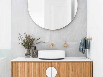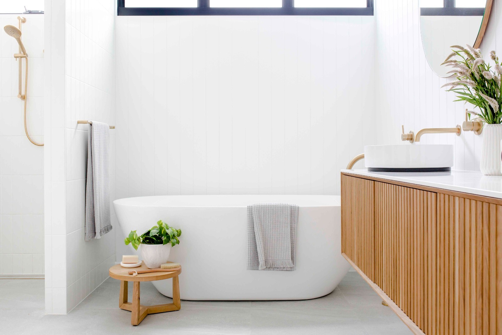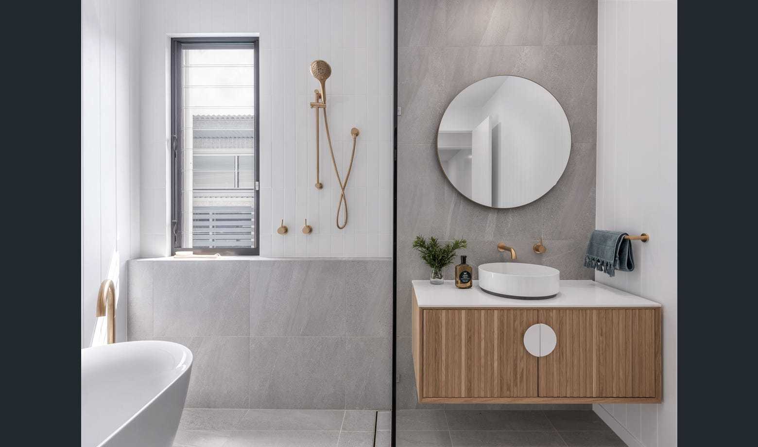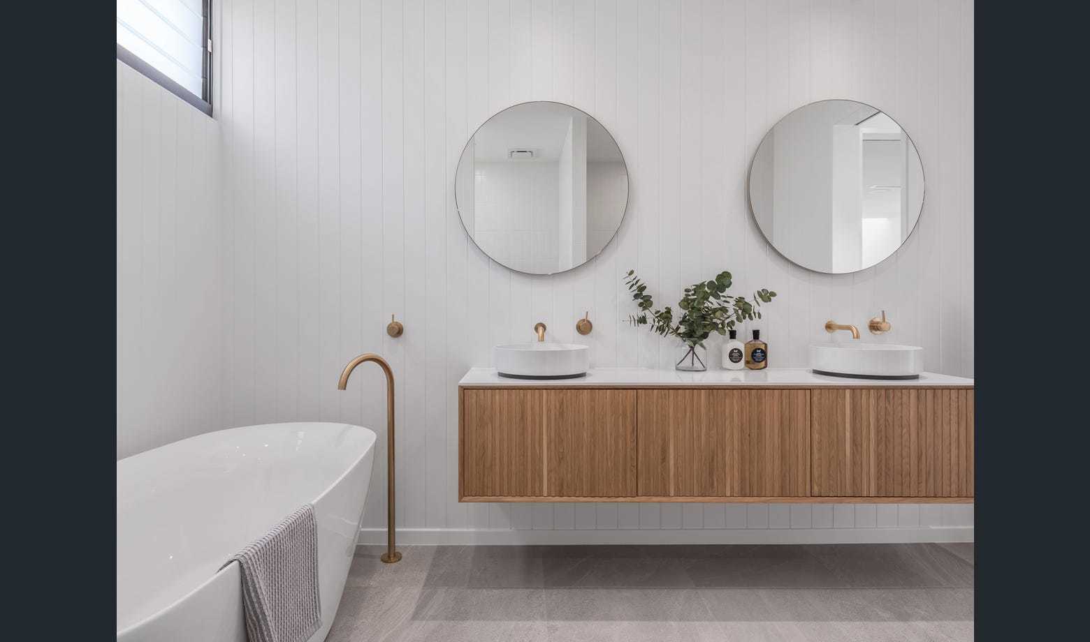 The master suite is luxuriously finished with stunning natural timber cabinetry, VJ panels, Italian porcelain and brushed brass tapware.