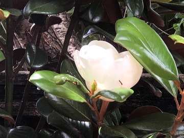 - Backyard is landscaped with bench settings, magnolia trees and tiles/lawn.