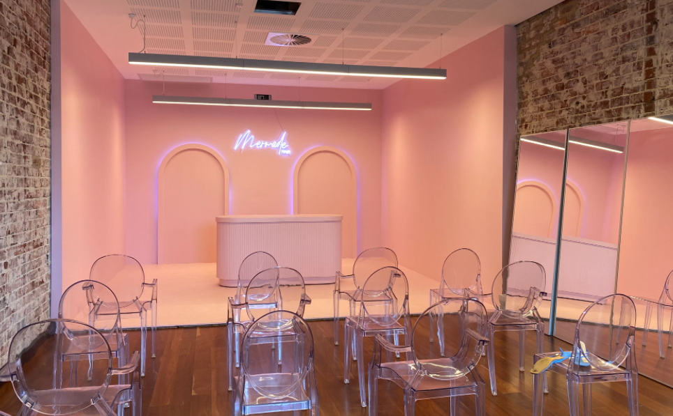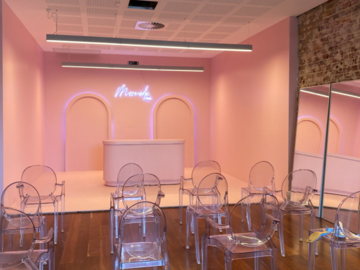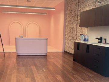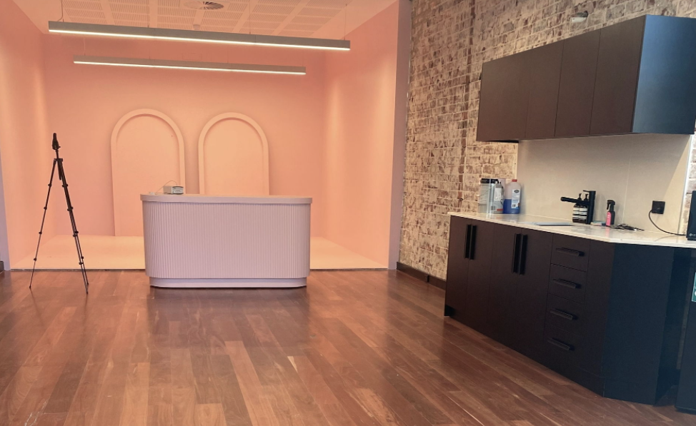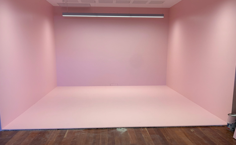 Pink Studio Space for photoshoots, events, videography with mobile arches + matching Pink Bar Table