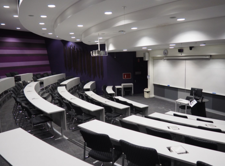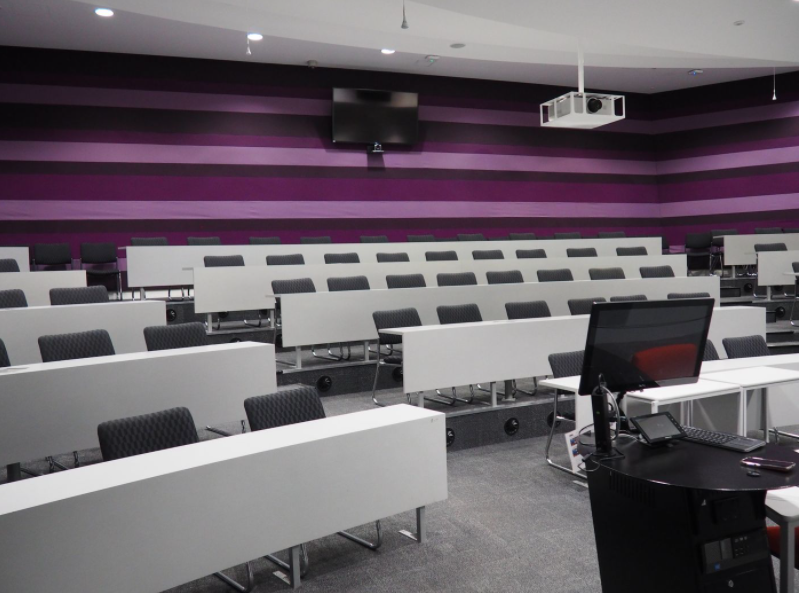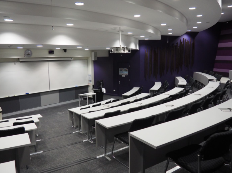 It offers a modern medium sized lecture theatre with tiered seating for 105 people. The theatre has fixed benches with moveable chairs. Equipped with contemporary audio visual equipment this space is perfect for a power point presentation or even a movie screening. An underpass located directly outside the theatre supports small group catering or as a registration/welcome area to the lecture area. Close access to male, female and disabled toilets is also provided. Wheel chair friendly access to the theatre.