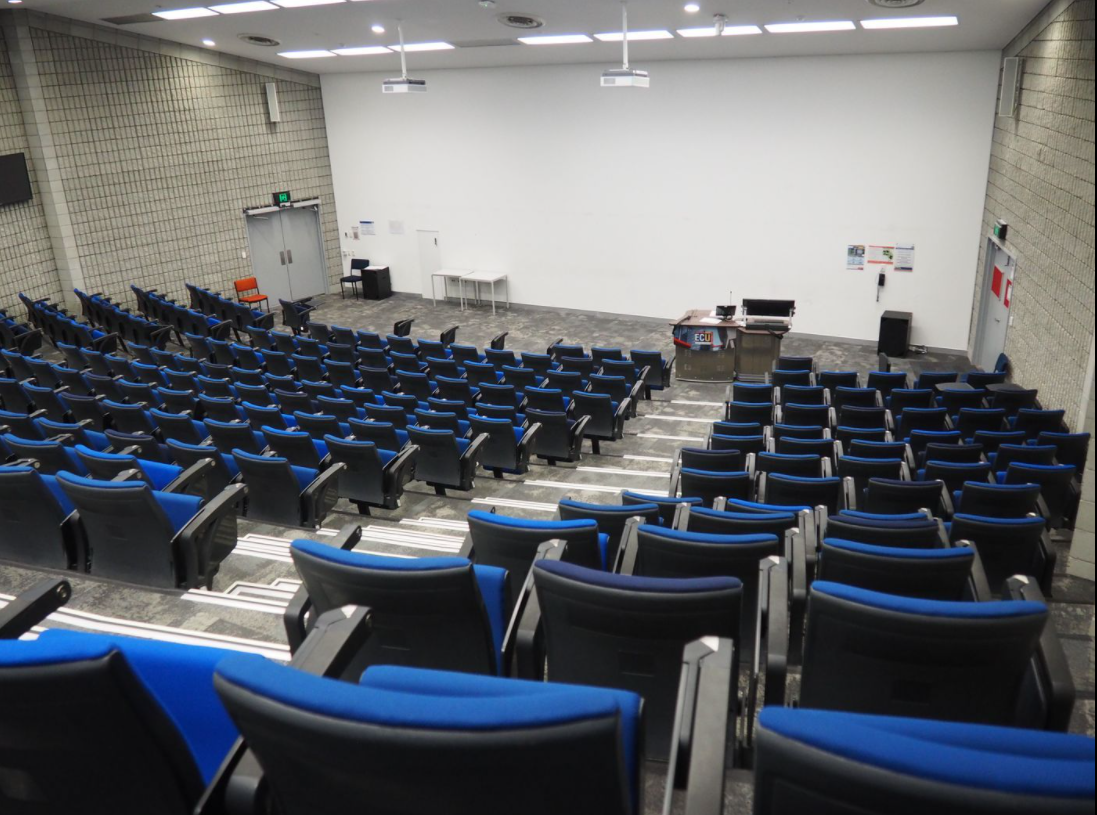 It offers a modern large lecture theatre with tiered seating for 262 people. The theatre has fixed fold-over writing tablet/arm rest style seating and is equipped with contemporary audio visual equipment, making this space perfect for a power point presentation or even a movie screening. The small undercover area located directly outside the theatre can serve as an area for group catering or for registration. The grassed area adjacent theatre additionally makes for a nice area for patrons to gather. Access to male, female and disabled toilets is close. This theatre is additionally wheel chair friendly.