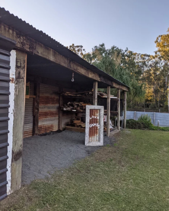 Rustic stables with Shed & lawn games like corn sack, darts, giant Jenga, ringtoss, Crikey & hokey board.