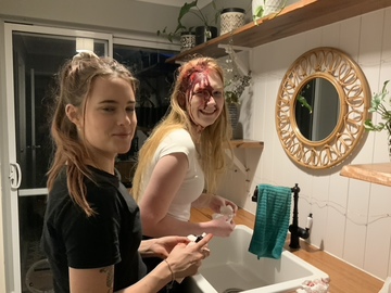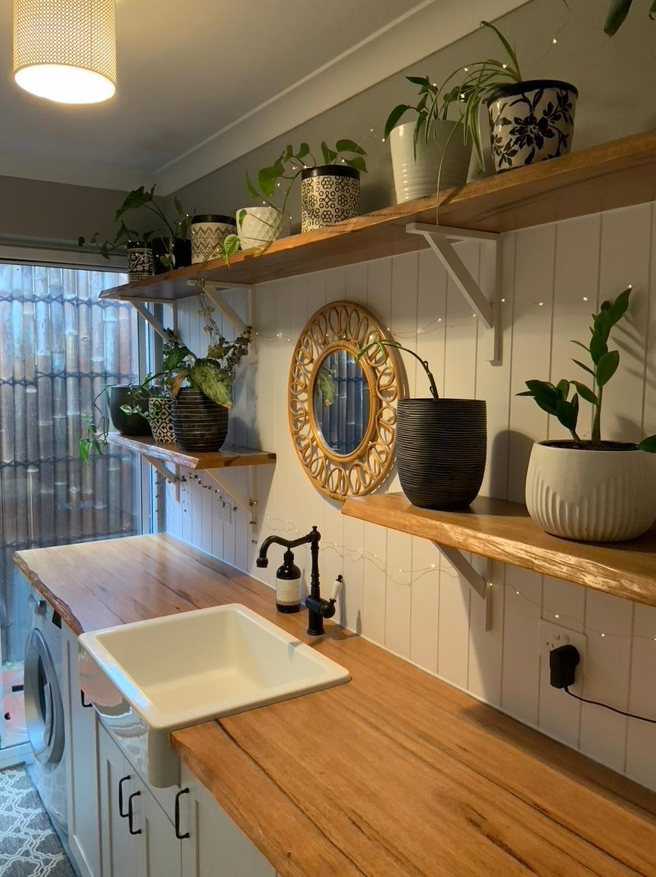 Laundry with Timber Paneled Walls, Oak Benchtop and Shelving