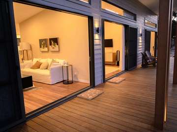 Magnificent sliding doors open onto generous balcony with seating to marvel at the changing light on the hills.