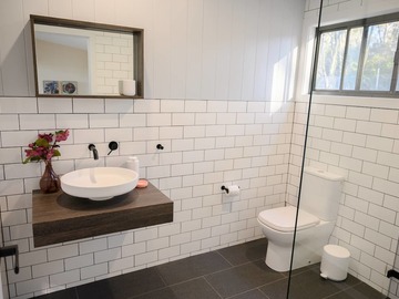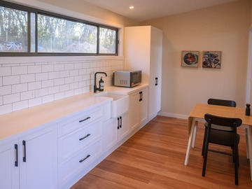Fully self contained one bedroom guesthouse with bathroom, galley style kitchenette (with convection/microwave oven and induction element) and fireplace.