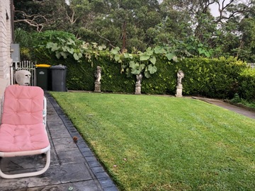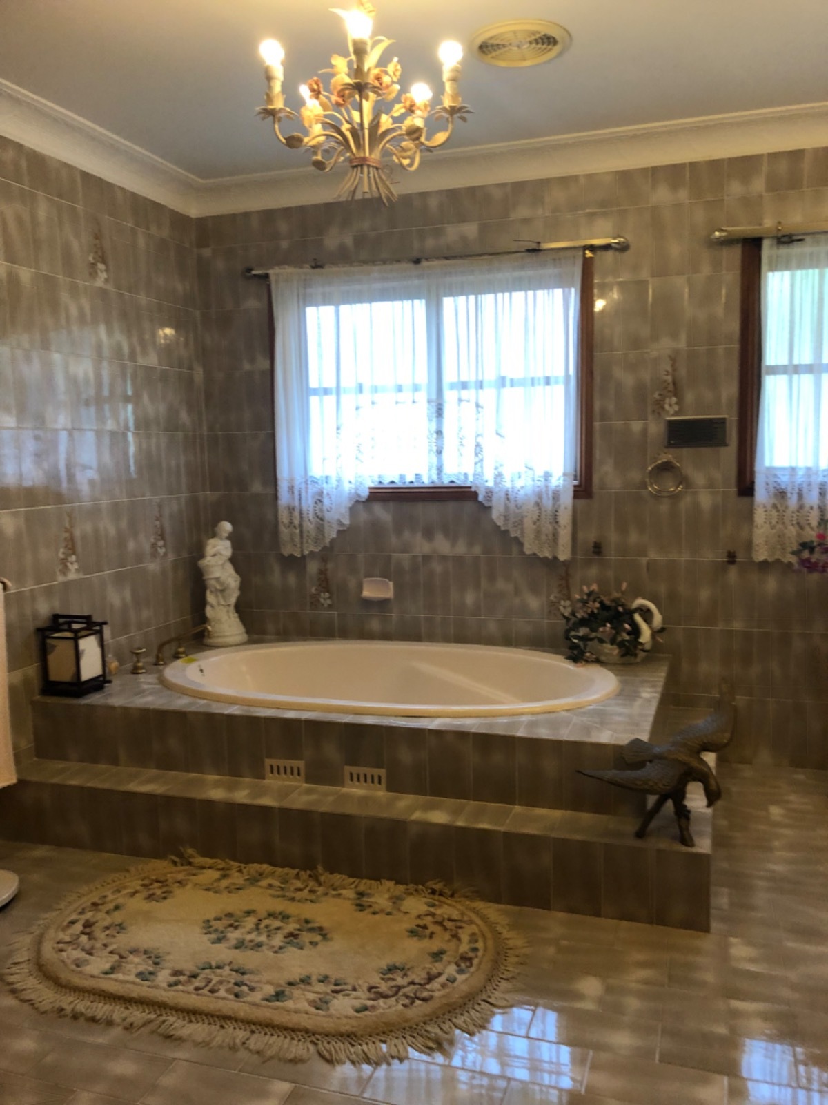 Opulent carpet and Priceline tiles. Bronze taps etc. Large green manicured garden with mature trees. Also a vintage Mercedes Benz in the garage.