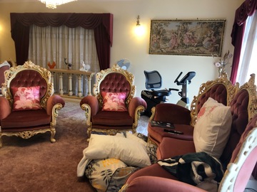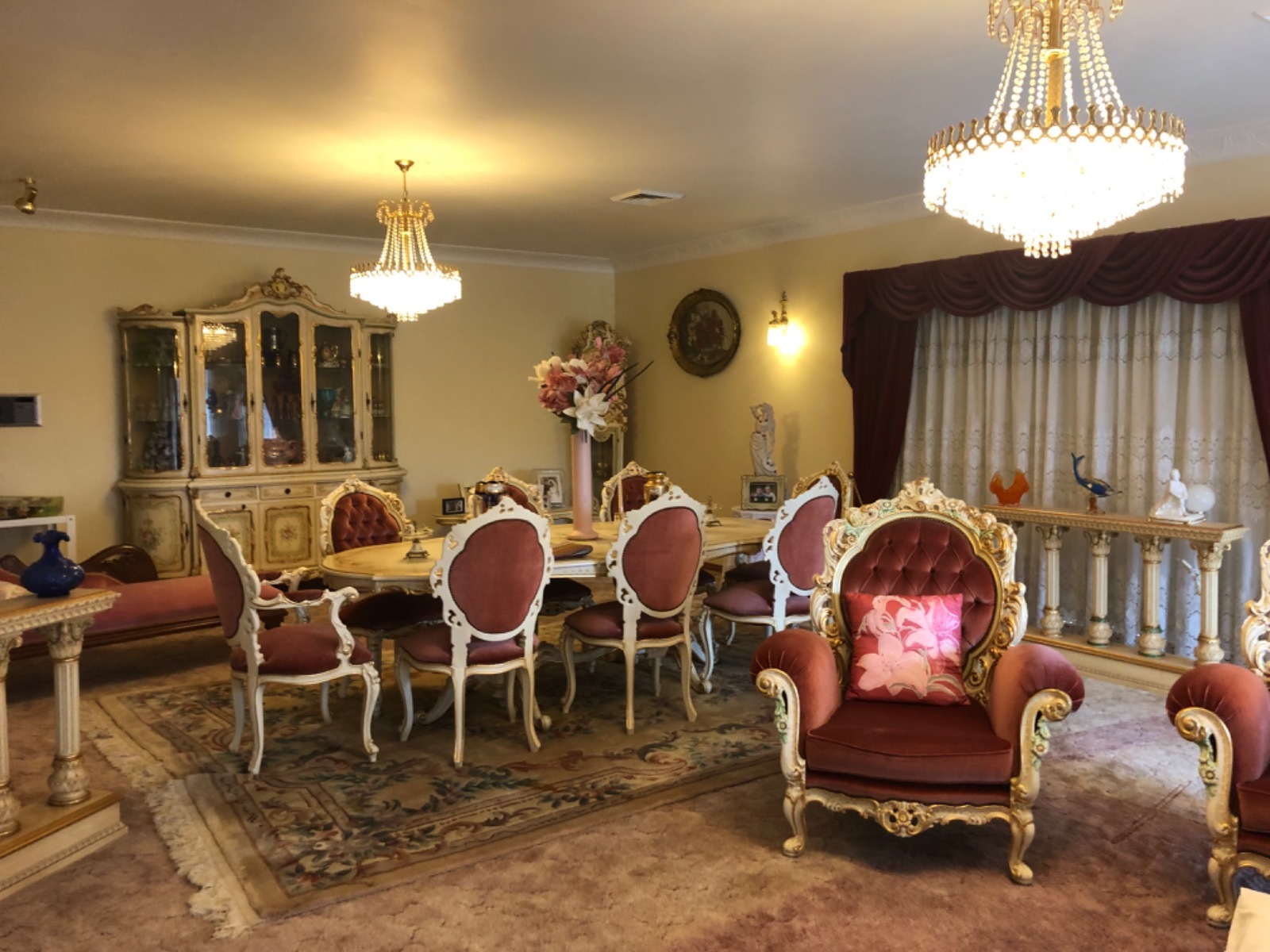 8 bedroom house, with over size themed bathrooms & lounge rooms, house features Baroque furniture, grand stair case and grand father clocks, and chandeliers.