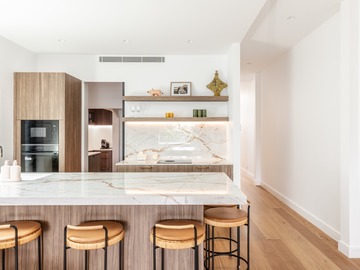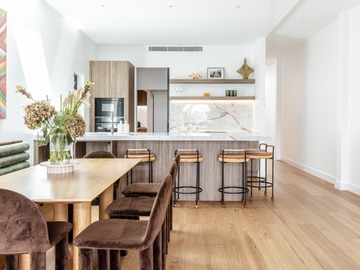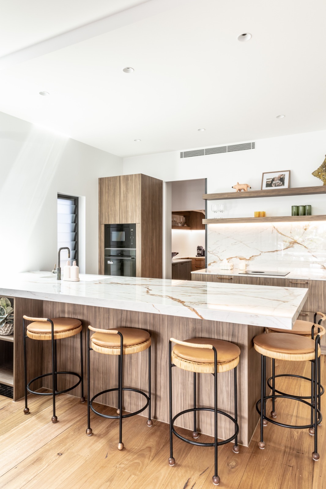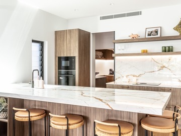 Large Designer Kitchen: Embrace your inner chef in our modern, walnut kitchen, equipped with top-of-the-line appliances and ample space for culinary creativity.