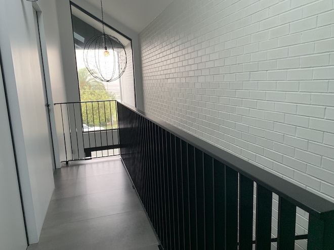 An ultra modern mezzanine floor with grey tiled floors, white brick wall and abundant natural light.