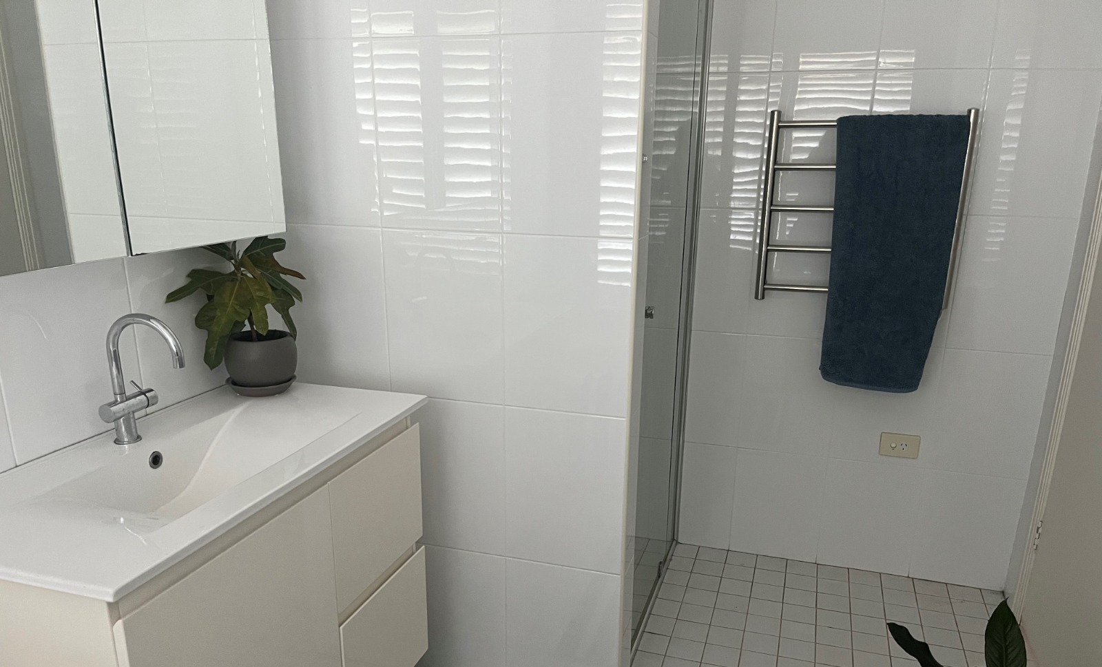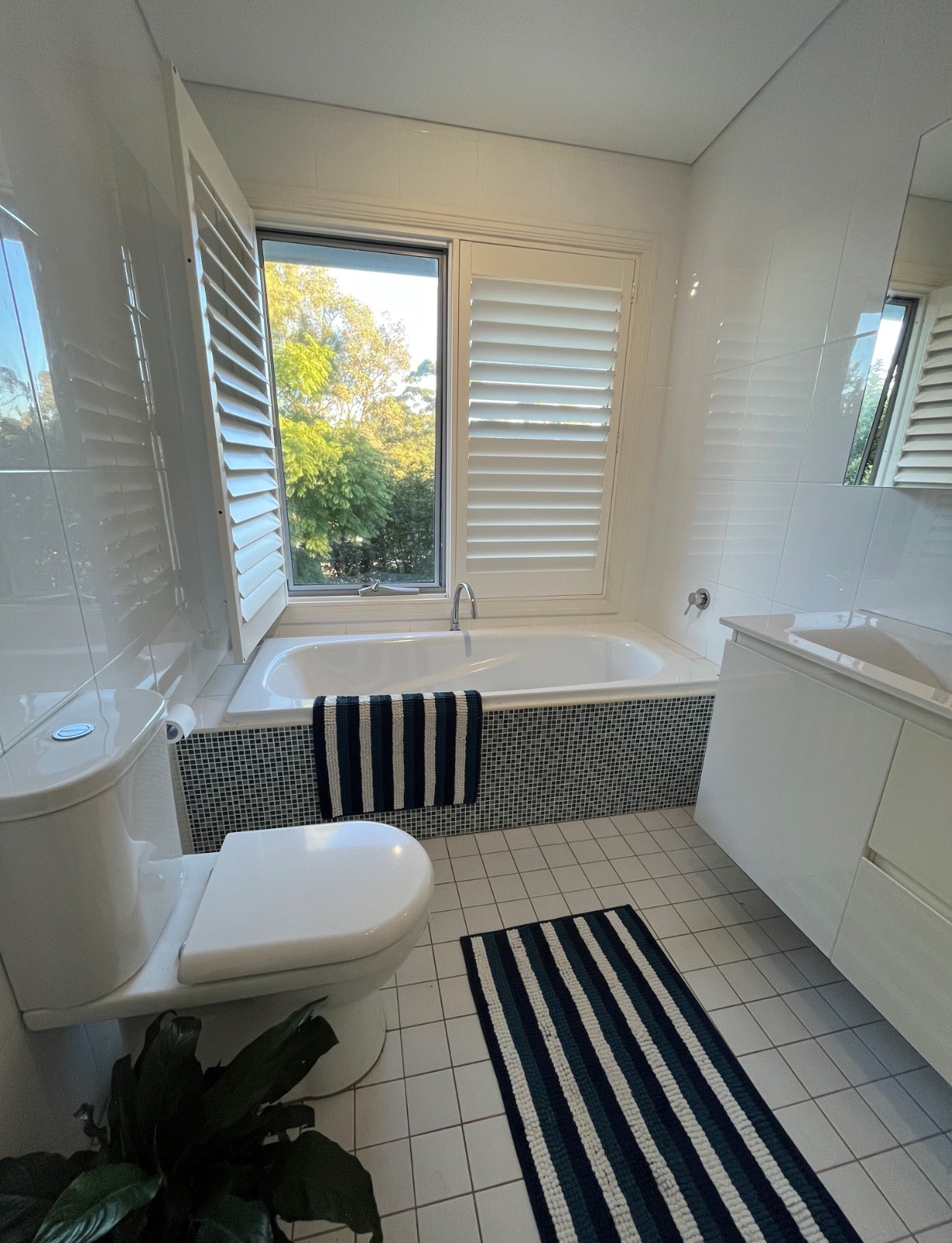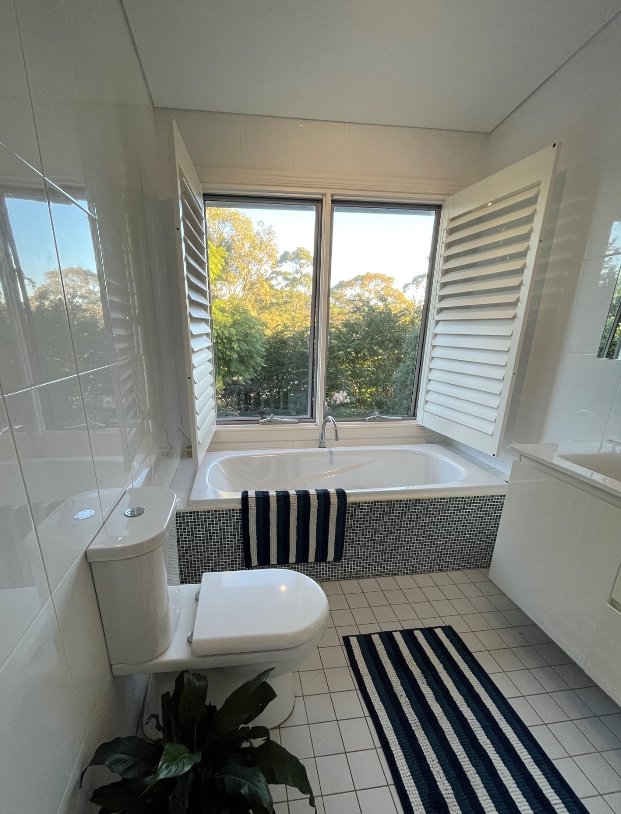 Spacious white bathroom with glass opening shower door. Full size bath, double windows with white plantation shutters. Plenty of access to shoot long or wide.