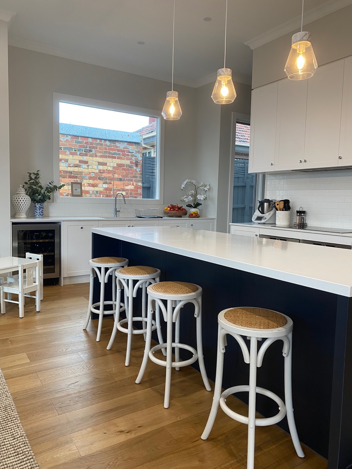 A brand new (late 2021) luxury Hamptons style home in the leafy eastern suburbs of Melbourne, including landscaped gardens and a pool.