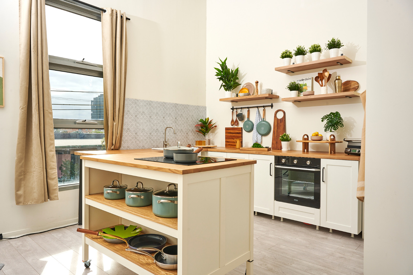 Flat floor accessible by lift with modular media kitchen where everything can be changed to suit your style. The kitchen set also boasts more than 500 props that meet every styling need for brand crafting and $5000.00 worth of GreenPan cookware in every colour imaginable. All props and cookware can be hired separately. Other premium facilities spanning over three levels, include a welcoming lounge for client comfort, a meeting space and makeup facilities. If you have seen Jamie Oliver type videos with shelves at the back and a space that can be styled, it is like this. We also have more floor space for those shooting on tables or background drops for food or product photography.