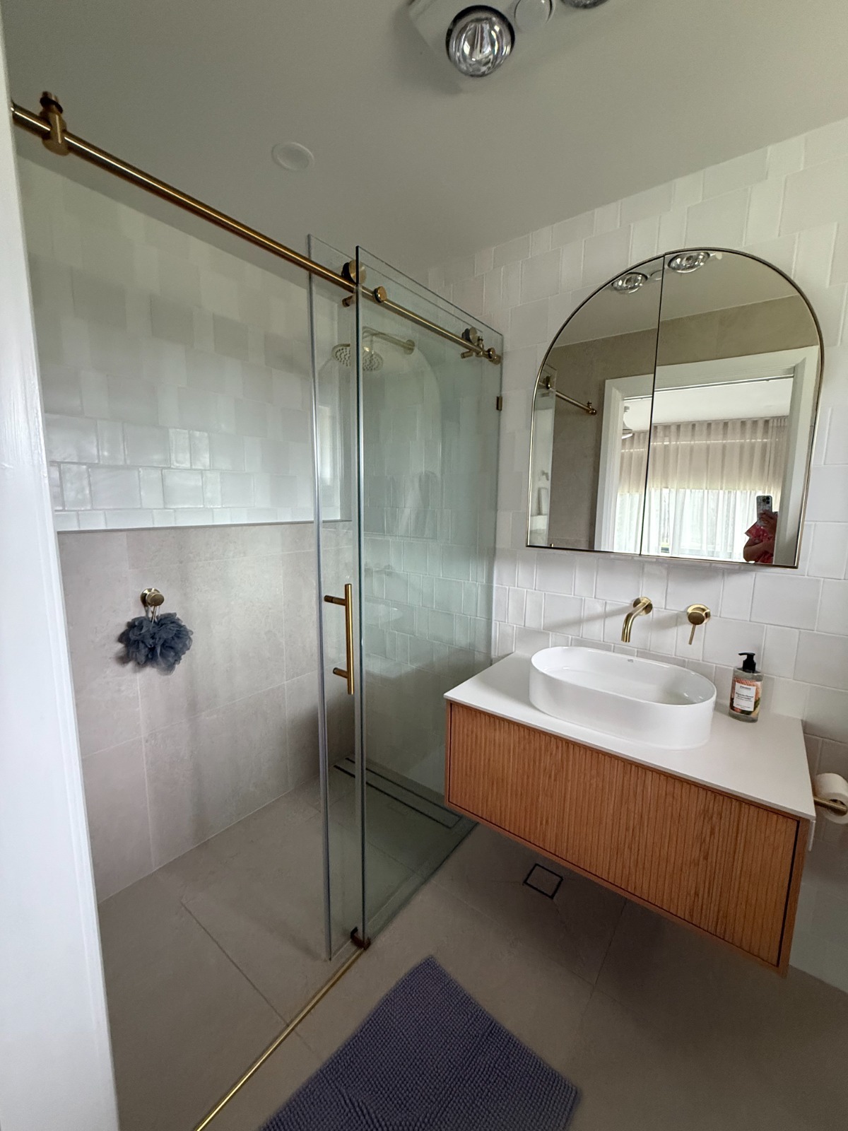 Modern brand new ensuite with Yabby Tapware. Neutral overlook warm feeling, attached to a master bedroom. Mirror has cabinet behind it.