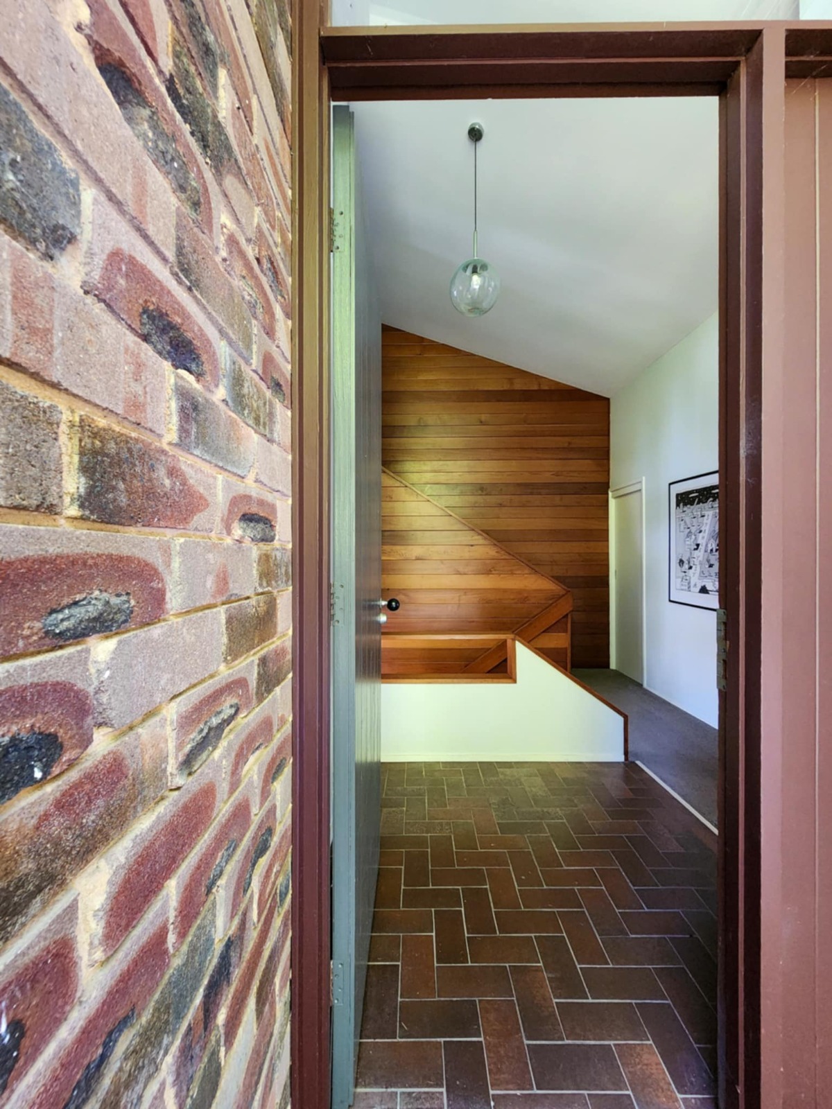 Original features include Red Cedar wall panelling, exposed timber beams, timber bannisters, and a 1970s bathroom. The foyer and loungeroom have vaulted ceilings, and the rumpus room contains large picture windows with a leafy outlook.