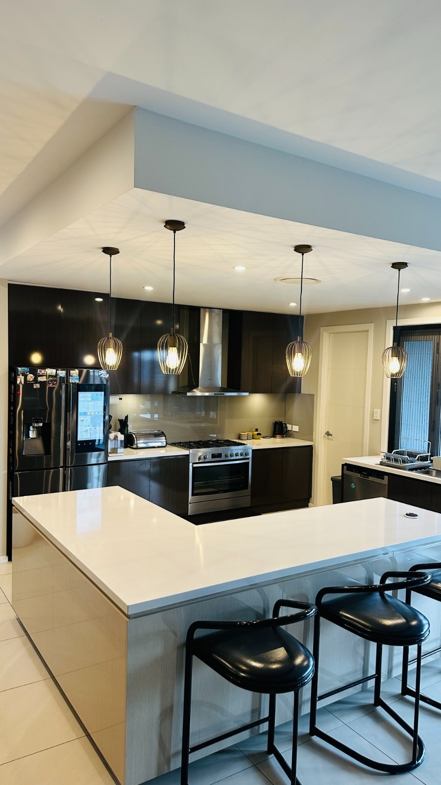 A large kitchen with a lots of bench space, double oven and cooktop, large fridge, spare freezer, with large dining table opening to an outdoor alfresco area