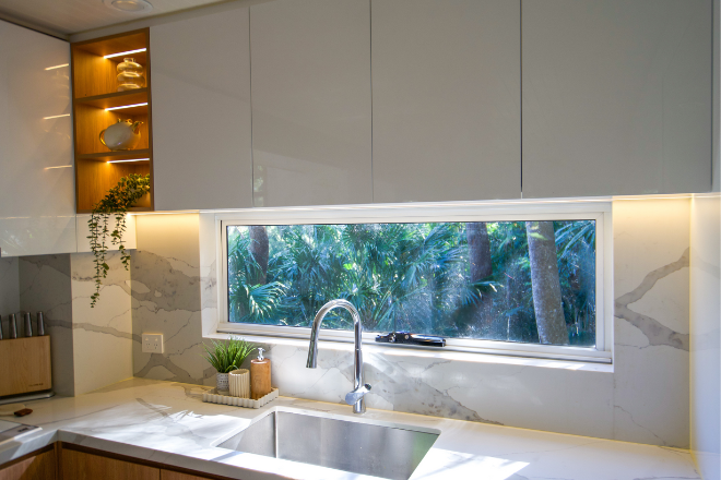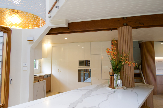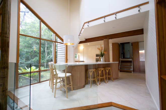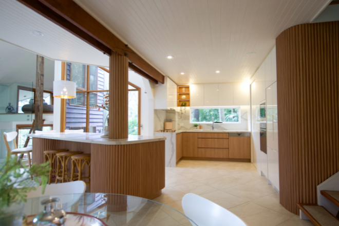 The split-level design immediately creates a sense of theatre. The imaginatively-designed bespoke kitchen anchors the space with sculptural presence. Fluted timbers, marble tops and curved lines juxtaposition beautifully with the angled windows and glass balustrades which dissolve visual barriers. The palette - tonal whites, honeyed woods and muted neutrals - serve as a canvas for shifting light and leafy views from every angle. Nature is never out of reach.