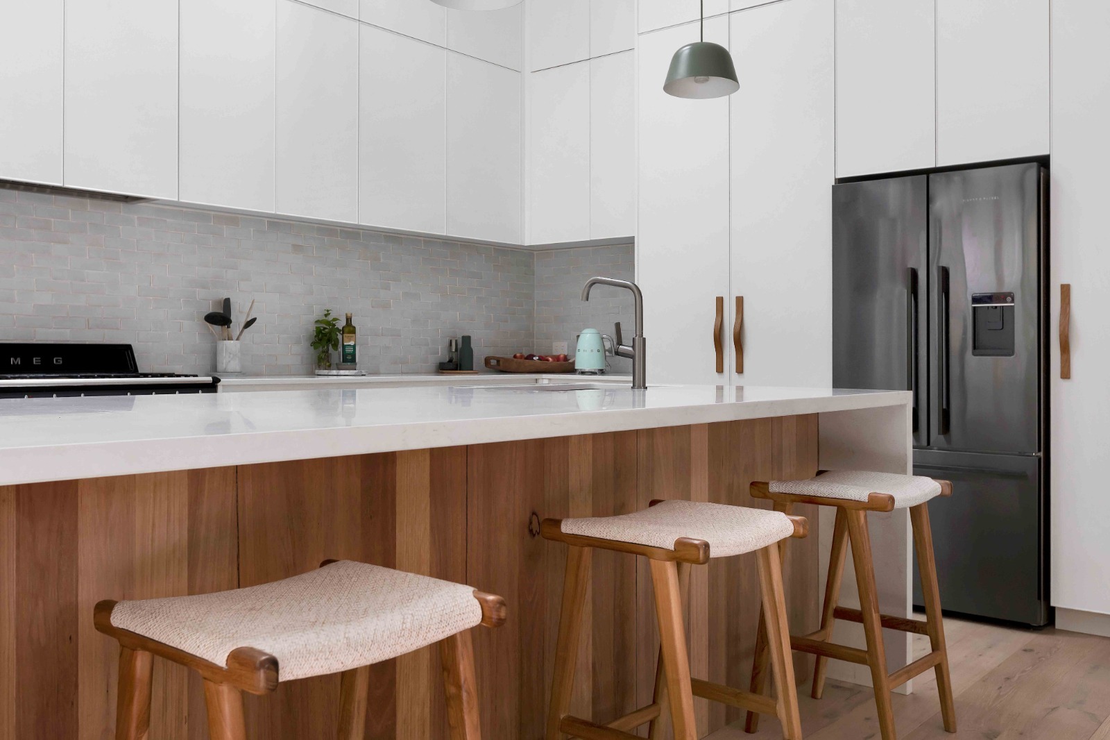 Blonde wood floors, handmade Moroccan tile splash back, Porters Bayleaf accents, lots of room and light.