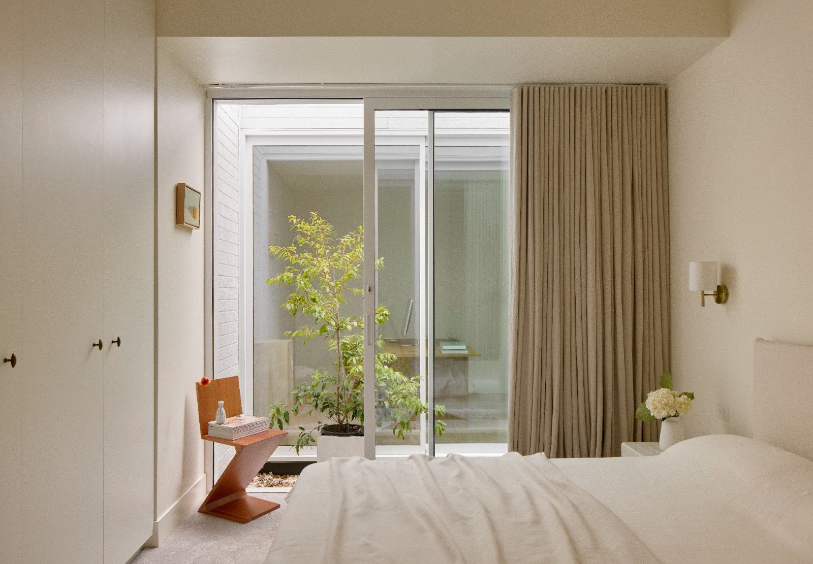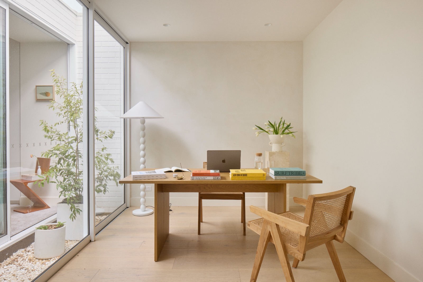 A former 1950s extension has been removed and replaced with a considered single-storey addition that maximises space, light, and long-term value. Floor-to-ceiling glass doors flood the rear living areas with natural light, while a tranquil internal courtyard with established maple trees sits between the bedroom and study, bringing greenery, privacy, and a calming seasonal rhythm indoors.