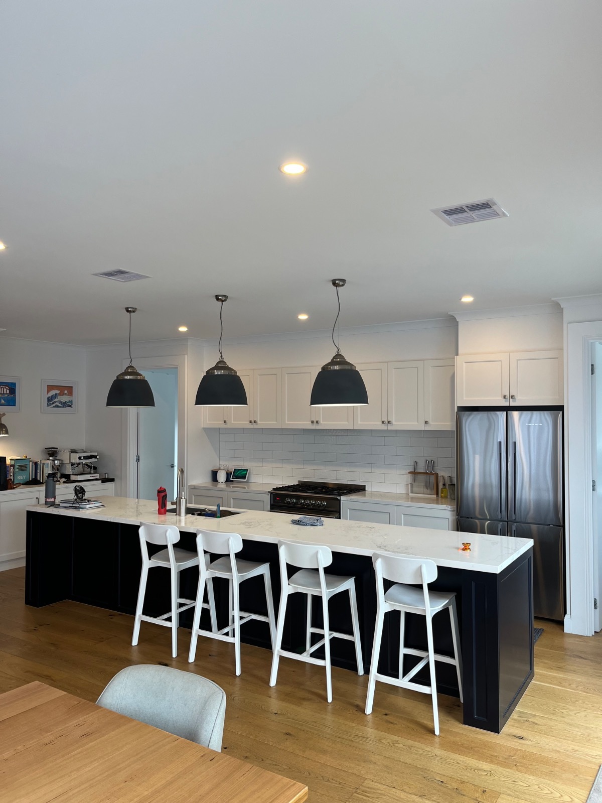 At the heart of the home, the stunning kitchen makes a bold yet sophisticated statement. Featuring a large island with stone benchtops, sleek dark cabinetry, premium appliances, and striking pendant lighting, it’s a space where form meets function. The adjoining dining and living areas flow seamlessly, creating an inviting hub for gatherings large or small.