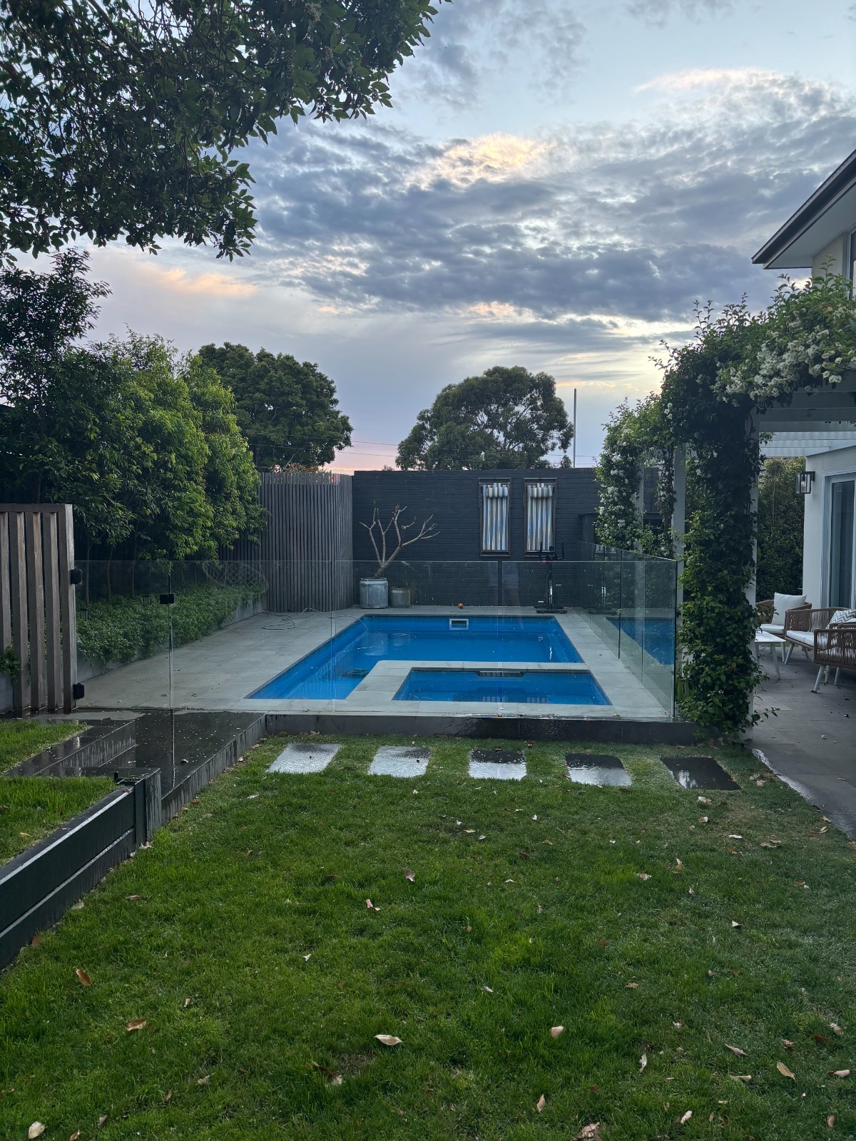 Glass doors open to reveal a true backyard sanctuary. The covered alfresco area overlooks a beautifully designed pool and spa, framed by glass fencing and landscaped gardens — perfect for summer entertaining, family fun, or peaceful relaxation. Whether hosting friends or enjoying a quiet morning coffee, this outdoor space feels like a private resort at home.