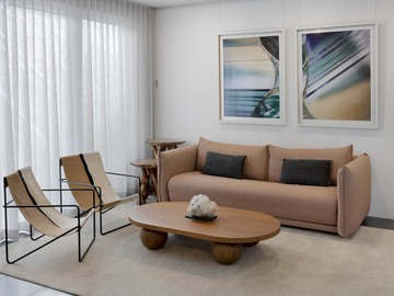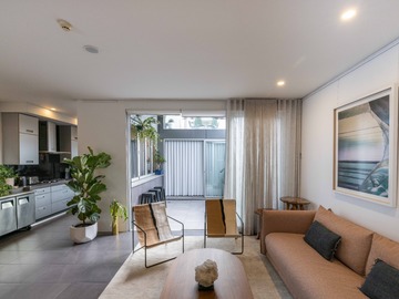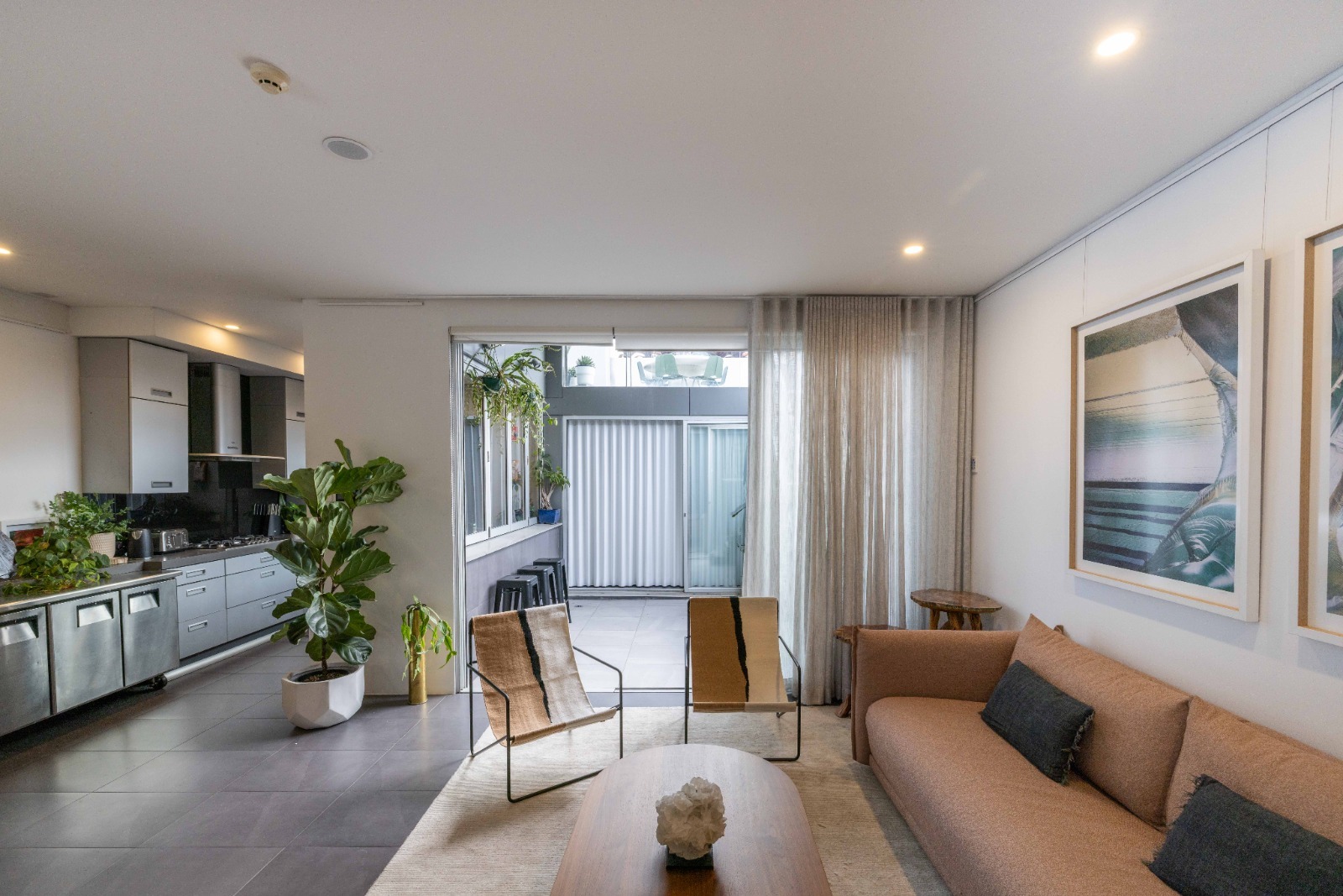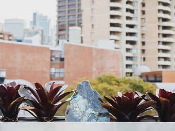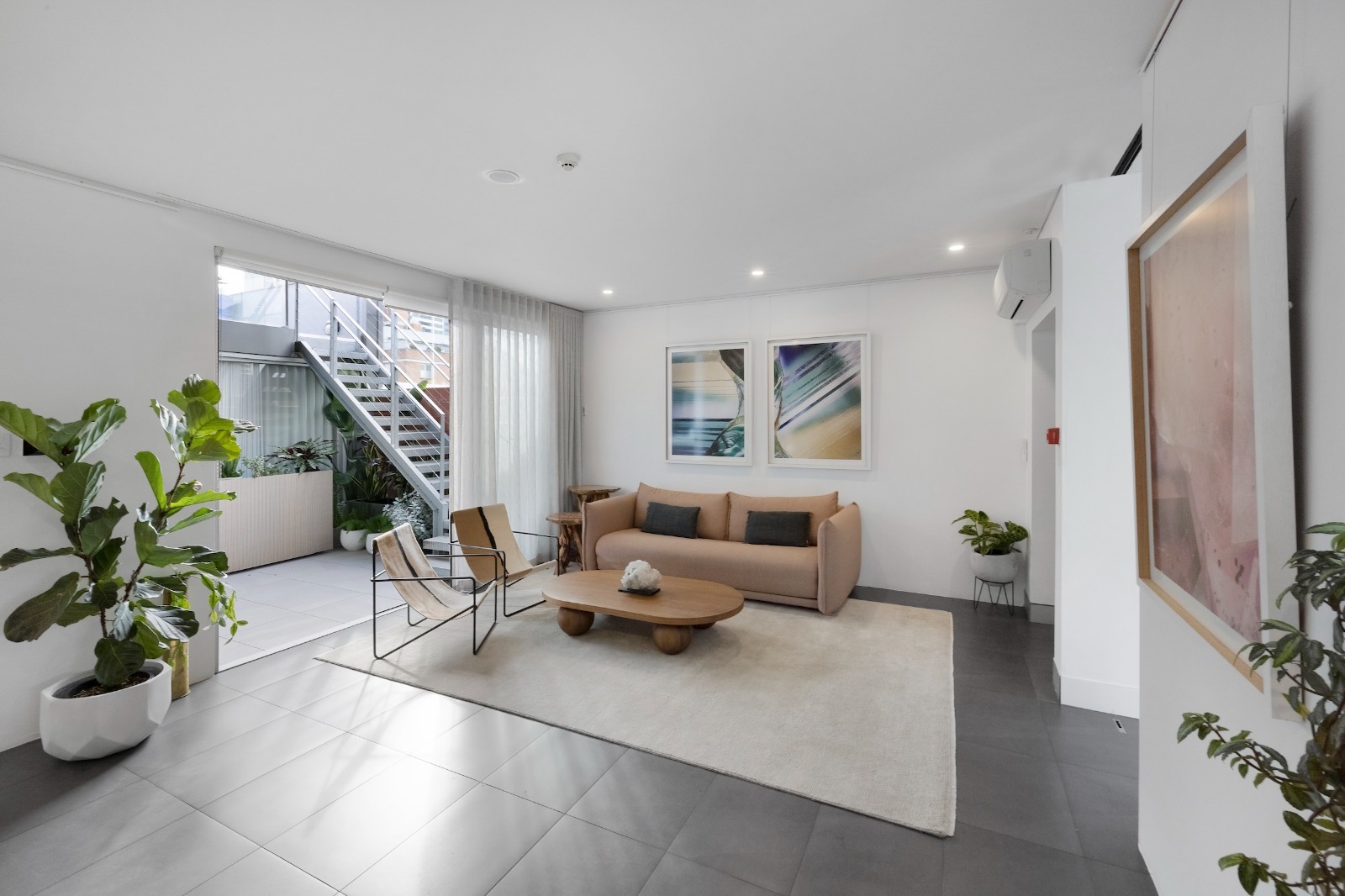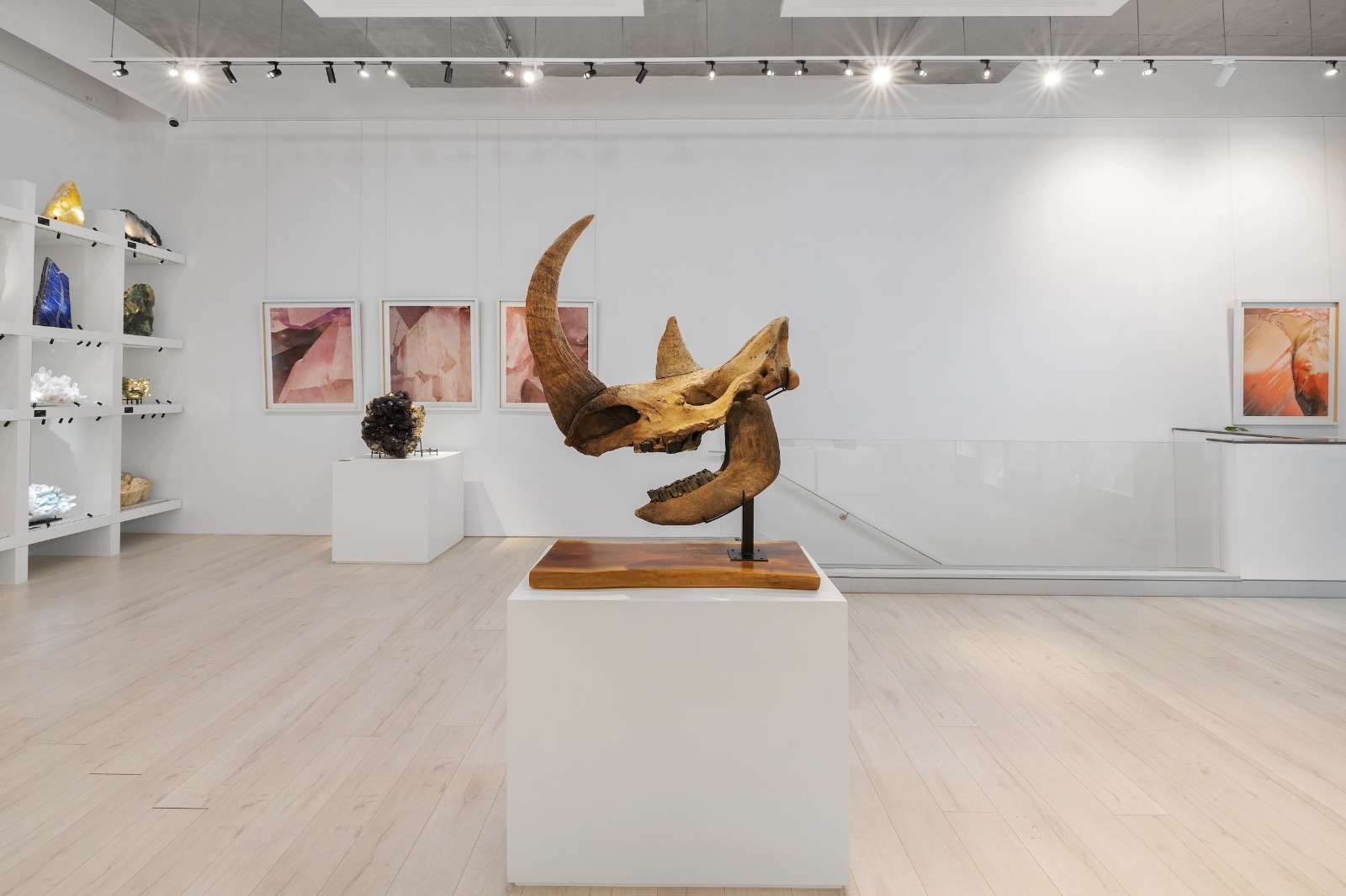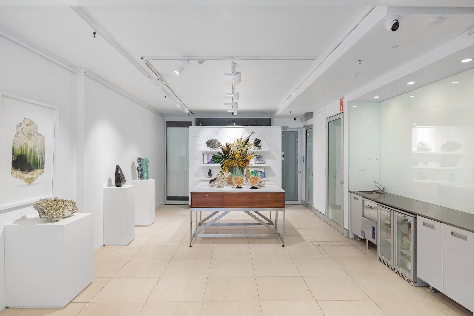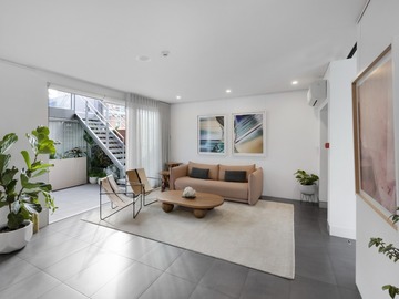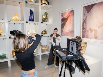 Our venue is a multi-level filming location in Darlinghurst offering three distinct spaces within one site. The first-floor Gallery Space features a dramatic double-height ceiling, curated mineral and fossil displays, adjustable gallery lighting, and AV infrastructure, ideal for museum-like or contemporary set environments. The ground-floor Blank Space is a minimalist white-box area with modular shelving and plinths, well suited to adaptable set builds and controlled shoots. The second-floor Home Space is a fully functional apartment with kitchen, living areas, courtyard, and private rooftop terrace, styled with natural stone elements and soft light diffusion. Contemporary finishes and diverse visual moods make B.C. House highly versatile for film and photography.