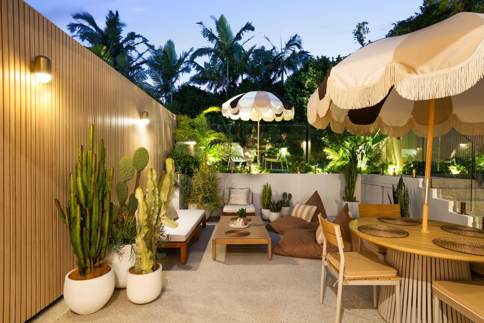 Combining resort vibes (palm planting, pool lighting, hanging chair, lush greenery, sauna) with modern coastal elegance (stone feature fireplace, plantation shutters, clean white joinery, warm timber floors), creating a space that feels both high-end and effortlessly laid-back—like a boutique holiday villa.