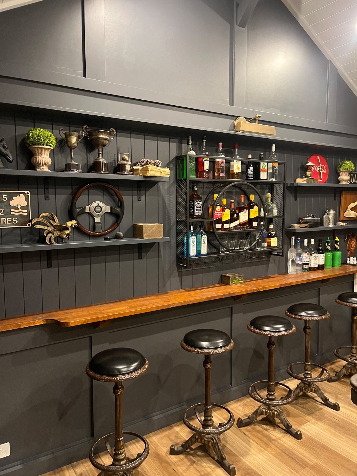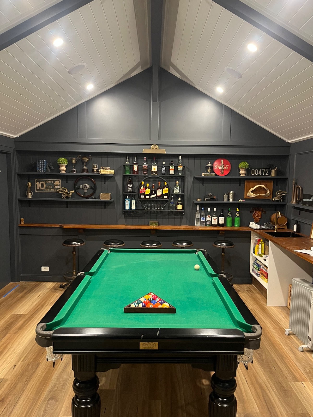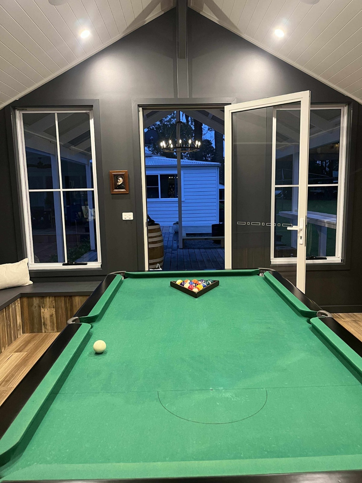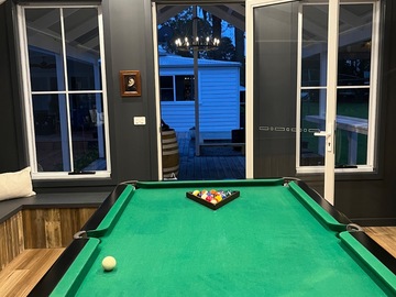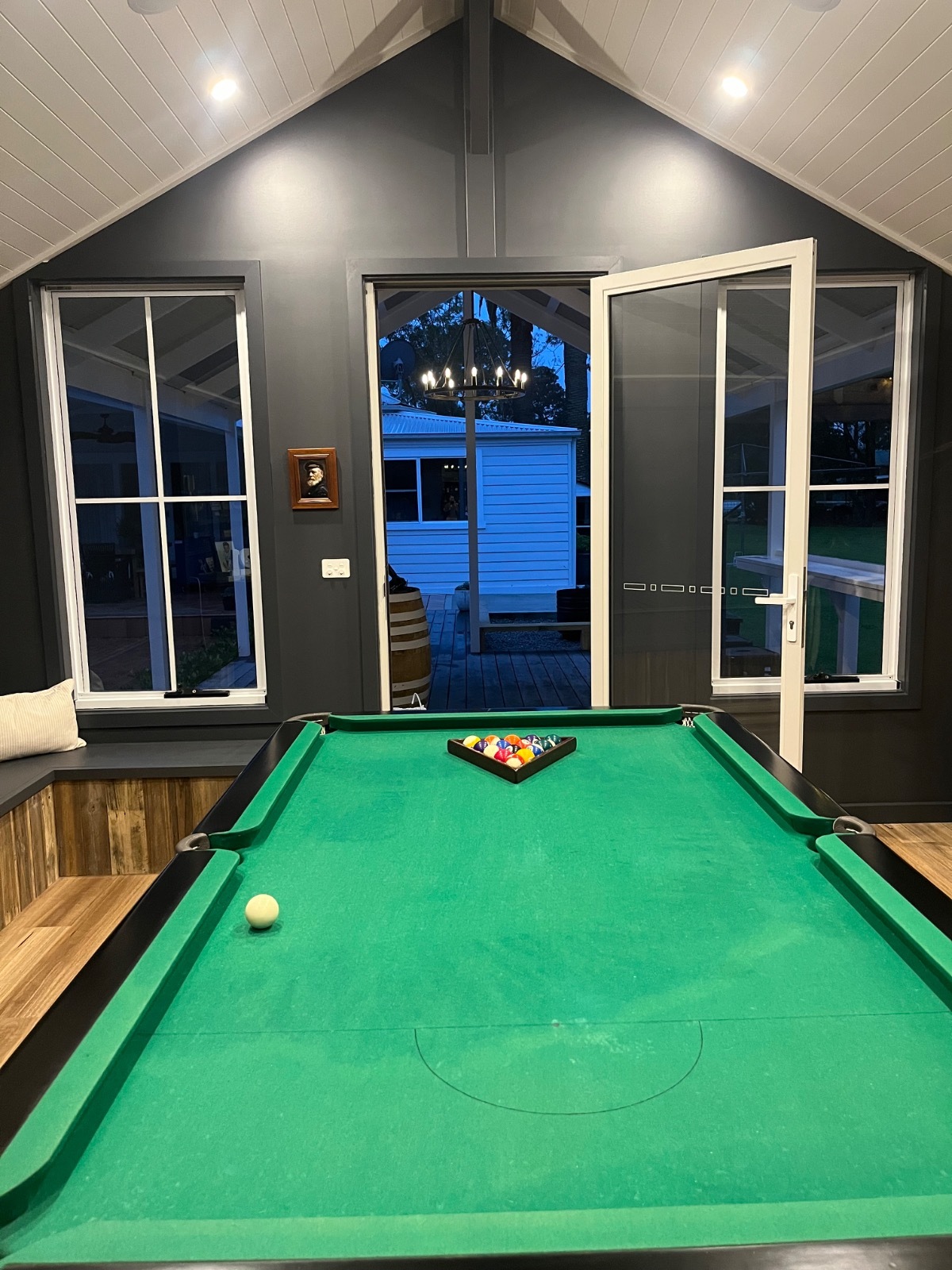Games room, with pool table, dart board alley & seating, great for filming a party. This room has a bathroom & men’s urinal in it as well. Sink, bar fridge area. Attached is a pergola and fire pit area and pool. A trellis arbour with grapevine & fairy lights which look beautiful of a night and on the other side festoon lighting over the pool.