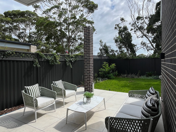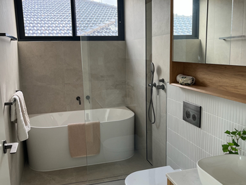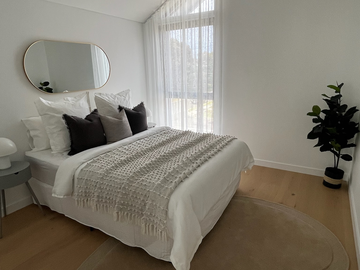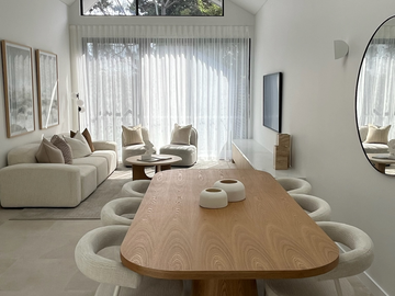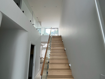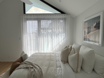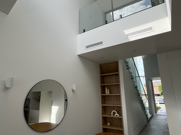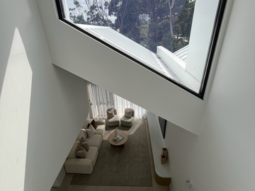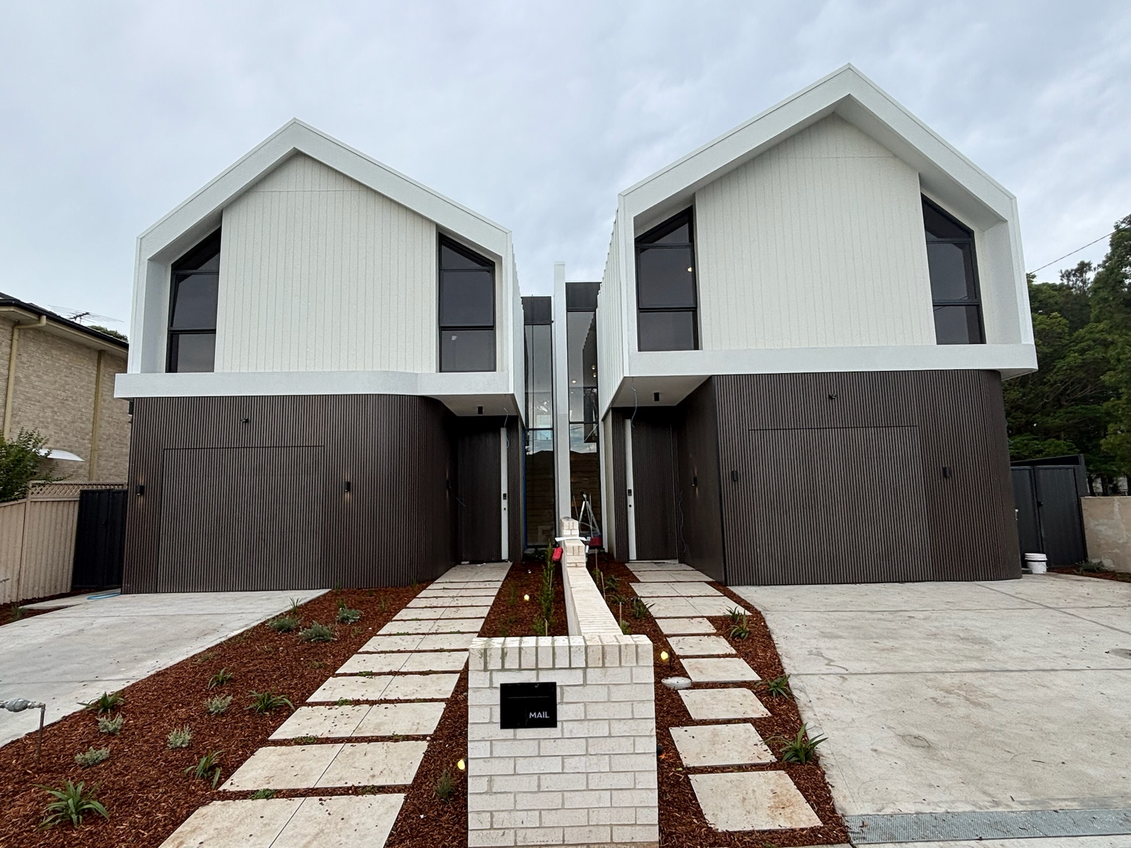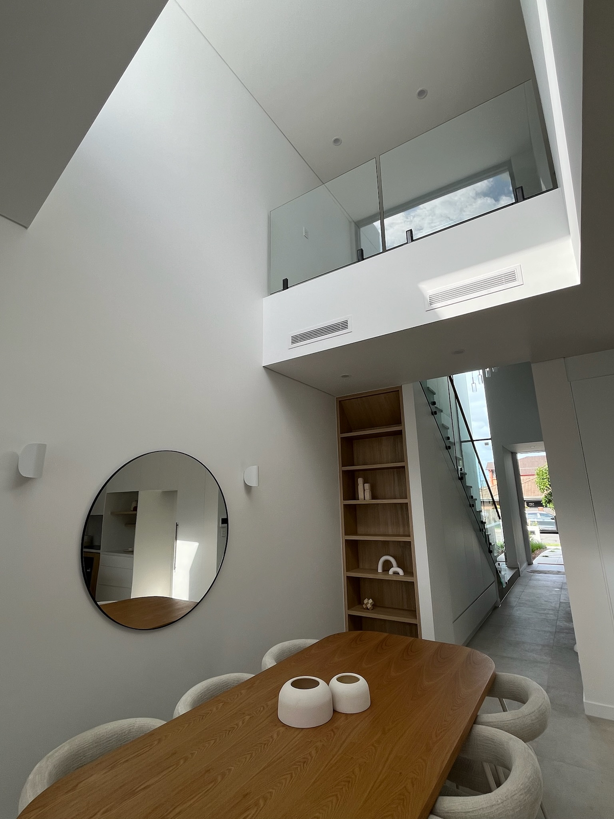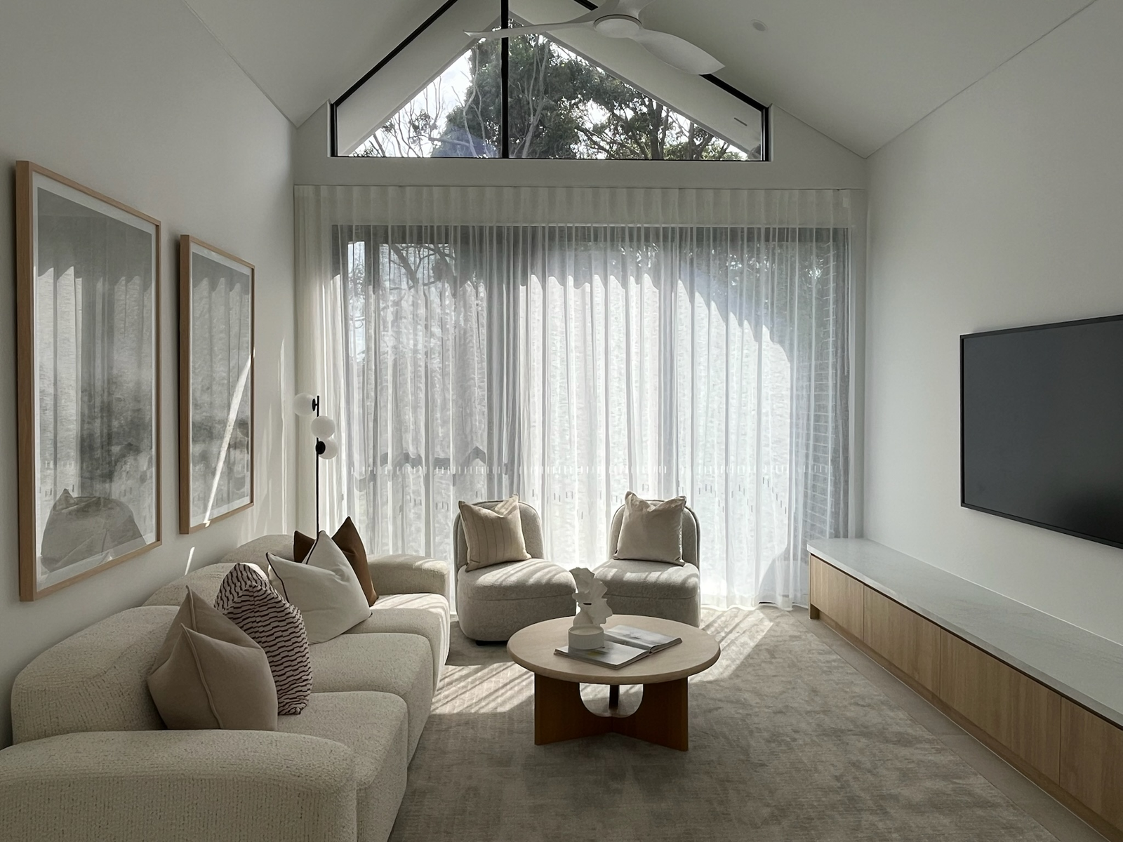 A bold & modern architectural duplex with clean modern lines on the exterior and a warm, welcoming light filled interior with cathedral ceilings, large void spaces, large format windows and a soft neutral colour palette.