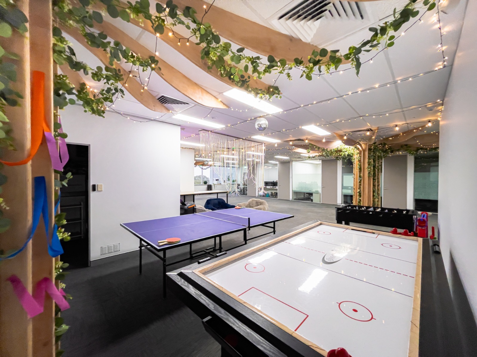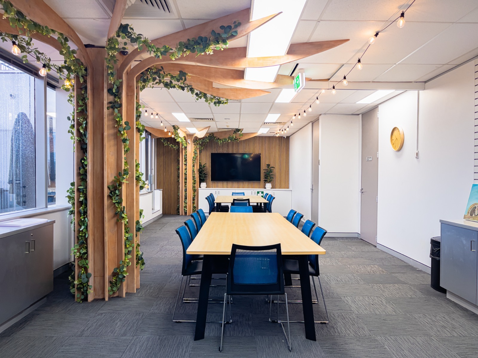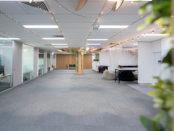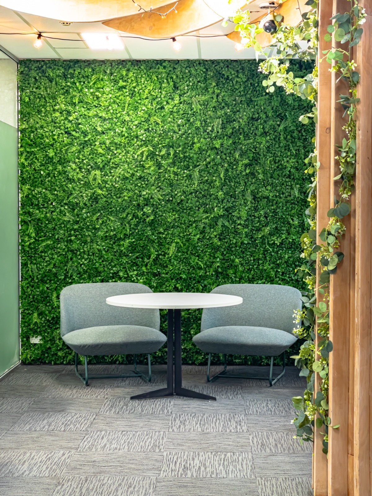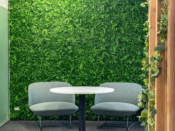 The layout includes a styled filming corner with a greenery backdrop, open meeting areas, and flexible seating that can be adjusted to suit your needs. Whether you’re filming content, hosting a client session, or running a workshop, the space adapts easily.